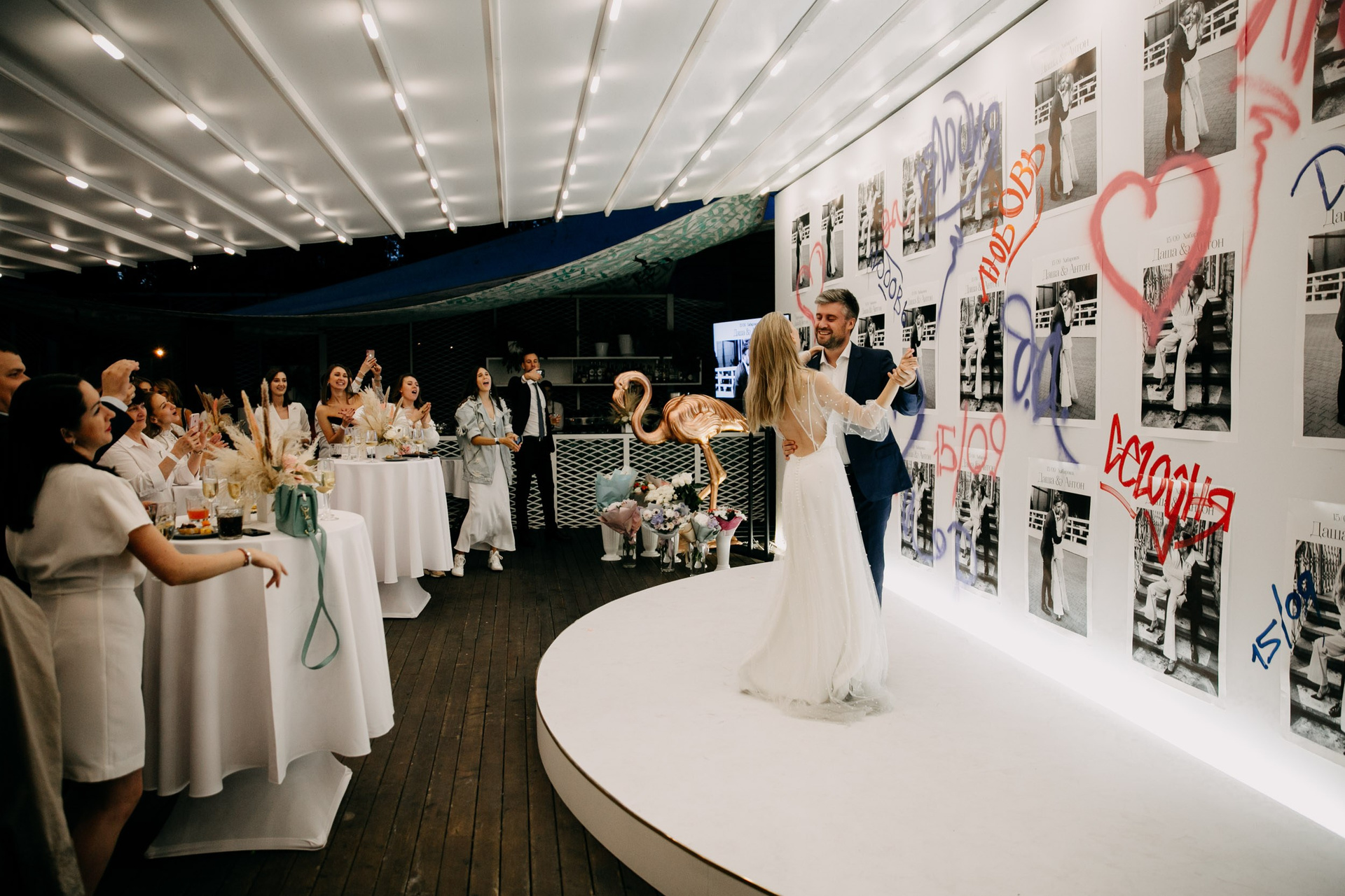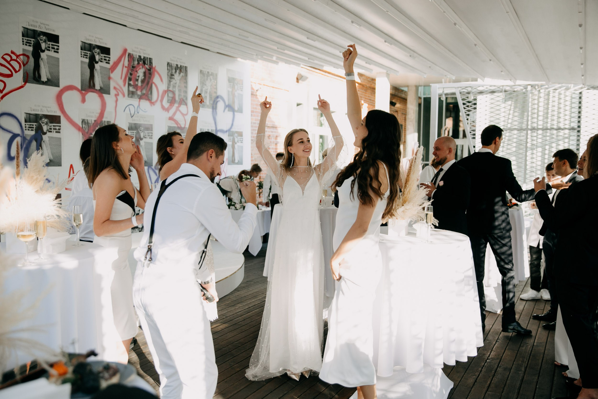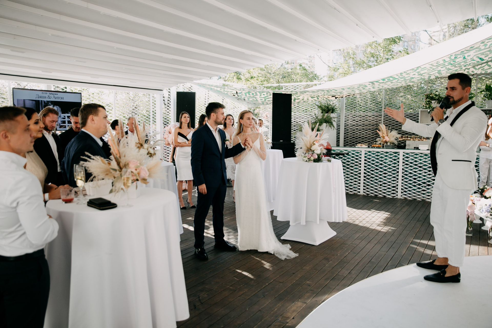 В целом отличный формат где гости не сидят за столами, а общаются, знакомятся, веселятся, и участвуют в общем веселье вместе с молодоженами, ресторан Эхо очень подходит для такого формата свадеб